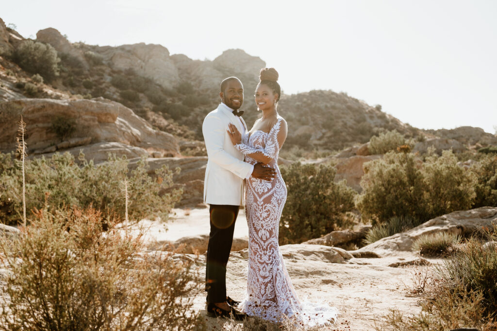 Nous sommes des voyageurs passionnés et avons fait de nombreux voyages ensemble en couple depuis que nous avons commencé à sortir ensemble. Lorsque nous avons planifié notre mariage à destination, nous avons choisi Palm Springs, en Californie. Nous avons choisi l’emplacement car il contenait certains des éléments de notre liste de contrôle : des paysages pittoresques et un temps chaud pour notre date de mariage début novembre. Lorsque nous nous sommes mariés, nous avons négocié avec notre photographe de mariage pour faire une séance photo le deuxième jour après le jour du mariage dans un endroit reculé avec les montagnes en arrière-plan. Pensez aux tumbleweeds et aux vastes étendues de terres désertiques naturelles juxtaposées à notre tenue de mariage formelle. Notre objectif était d’avoir une diffusion éditoriale de photos au lieu des photos traditionnelles du jour du mariage sur le site.