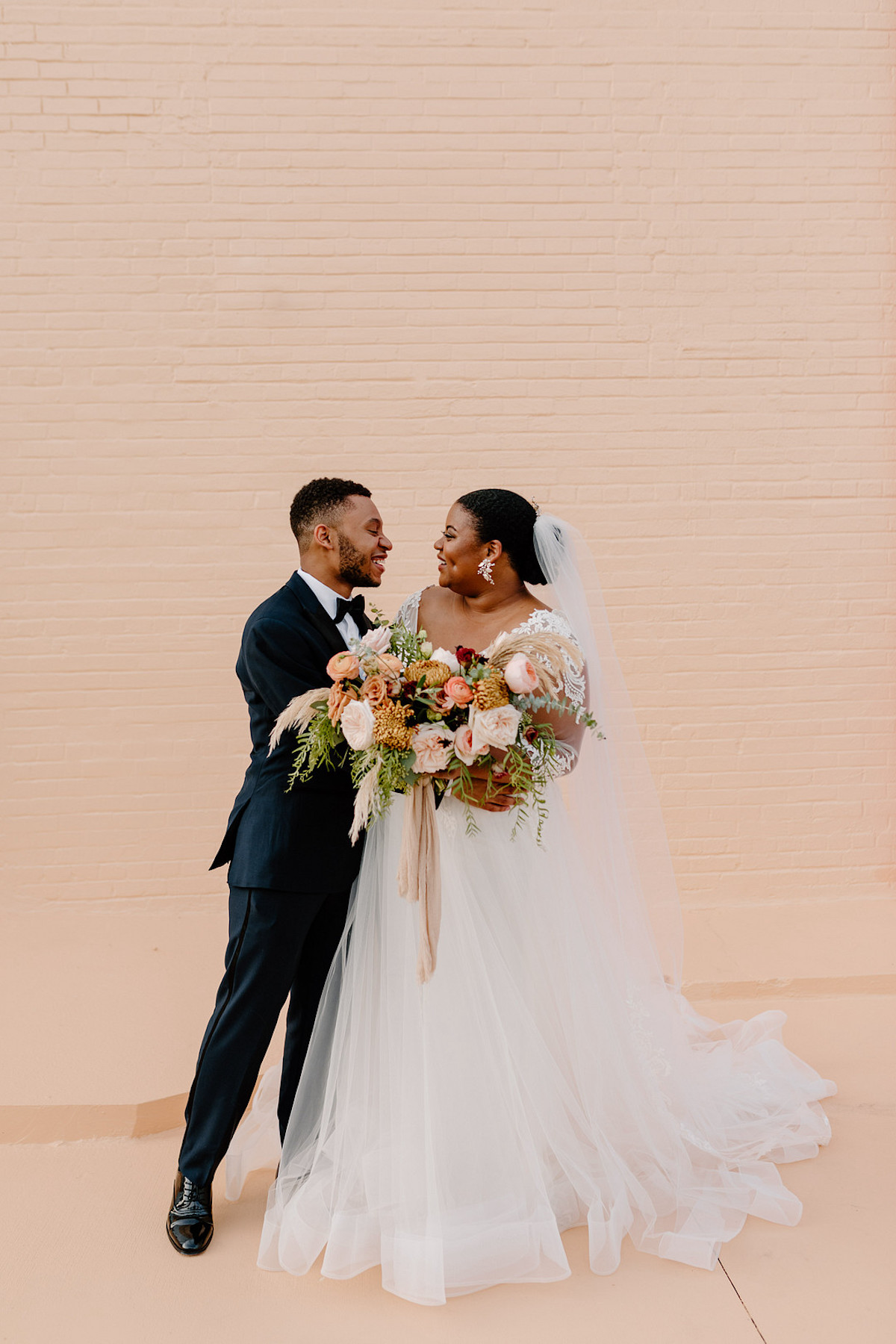 Leur mariage bohème industriel comportait de magnifiques fleurs pêche et blush, avec des touches de teintes dorées chaudes et un décor moderne. Ils ont inclus l’allumage d’une bougie d’unité dans leur cérémonie, qui a été un moment très spécial et symbolique pour le couple et leurs proches. Gabrielle et Christian ont également inclus des vœux auto-écrits, qui ont fait pleurer tout le monde.